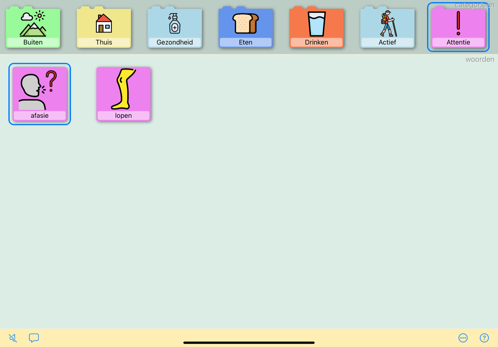Categorieën en woorden zijn voorbeelden van de items die beschikbaar zijn in Communicado. Nadat je hebt genavigeerd naar de gewenste informatie kun je een item selecteren (aantikken), om met iemand te communiceren. Binnen een laag kan maar één item geselecteerd zijn; het heeft een blauwe lijn om zich heen. Als alternatief kun je het item ook openen.